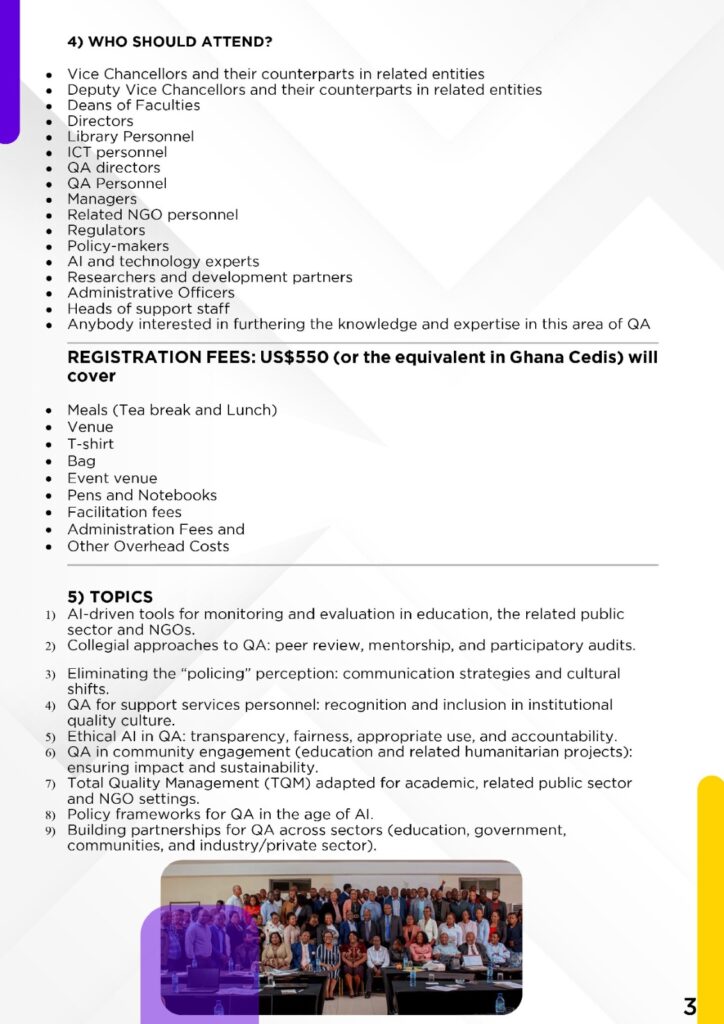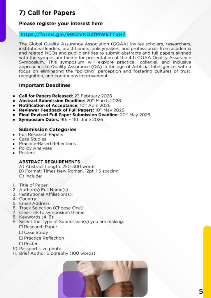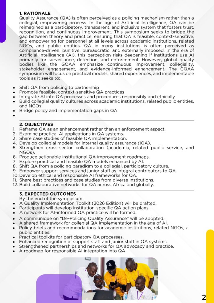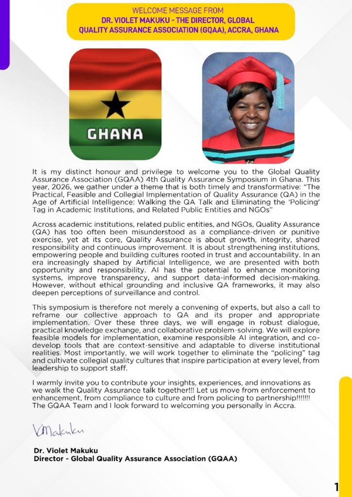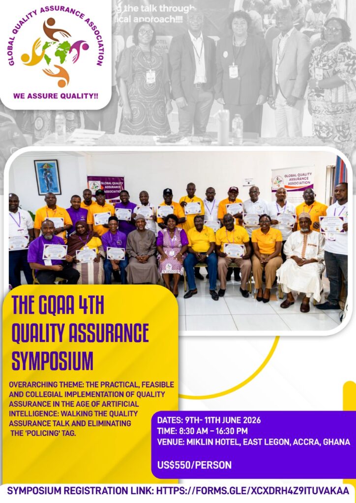 UPCOMING & PERENNIAL EVENTS REGISTER FOR RESOURCE MOBILIZATION & GRANT WRITING REGISTER FOR one day Seminar for Support Services Personnel REGISTER FOR 4TH LIBRARIES CONVENTION REGISTER FOR 4TH QUALITY ASSURANCE SYMPOSIUM GLOBAL QUALITY ASSURANCE ASSOCIATION (GQAA) ONLINE COURSES QUALITY ASSURANCE IN HIGHER EDUCATIONRegister Now RESOURCE MOBILIZATIONRegister Now WRITING OF GRANT WINNING PROJECT & RESEARCH PROPOSALSRegister Now RESEARCH SUPERVISION & MARKINGRegister Now THE BLENDED & LEARNER CENTRED TEACHING & LEARNING SKILLS: FOR THE COMPETENCE- BASED CURRICULUM & THE ACHIEVEMENT OF LEARNING OUTCOMESRegister Now a) COMPLETING THE RESEARCH CYCLE: RESEARCH METHODS, ACADEMIC WRITING SKILLS, JOURNAL ARTICLES b) WRITING OF A MASTERS/ PHD PROPOSALRegister Now EFFICIENT & ETHICAL USE OF ARTIFICIAL INTELLIGENCE (AI) IN ALL SECTORS' WORKPLACES INCLUDING THE EDUCATION SECTORRegister Now CLICK HERE TO REGISTER FOR THE A.I. ONLINE WORKSHOP CLICK HERE TO REGISTER FOR THE INSTITUTIONAL ASSESSMENT & EVALUATION FOR SELF IMPROVEMENT WORKSHOP